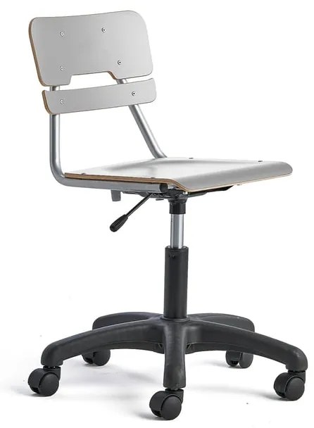 Univerzálna a výškovo nastaviteľná otočná školská stolička so sedákom a operadlom z odolného vysokotlakového laminátu, ktorý sa ľahko čistí. Výšku stoličky je možné nastaviť pomocou malej páčky pod sedadlom. Stoličku je možné ľahko prispôsobiť žiakom rôzneho veku a výšky. Ergonomickým riešením na dlhé sedenie v školách sú výškovo nastaviteľné stoličky! LEGERE je veľmi pohodlná a robustná výškovo nastaviteľná otočná školská stolička, ktorá sa hodí do každej triedy! Výšku stoličky môžete nastaviť pomocou páky poháňanej plynovým piestom. Vďaka tomu ju môžu ľahko používať aj malé deti. Stolička má robustný rúrkový oceľový rám a sedák a operadlo sú vyrobené z odolného vysokotlakového laminátu. Ten je ideálny pre školy, pretože je odolný a ľahko sa čistí. Stoličky sa dodávajú vo vysokom a nízkom prevedení s kolieskami alebo klzákmi a dvoma rôznymi veľkosťami sedadla. Oba modely sú výškovo nastaviteľné a majú otočný sedák. Tento model stoličky LEGERE má malý sedák, takže je vhodný pre mladšie alebo menšie deti v nižších ročníkoch.