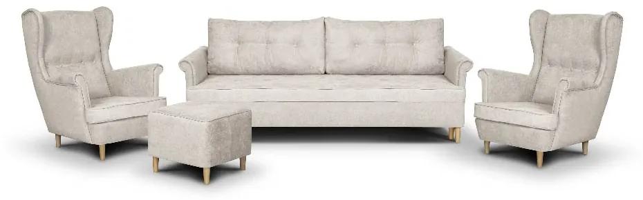 Súprava ELIA Ušiak Béžová ( POHOVKA+2x KRESLO+PODNOŽKA) Súprava trojmiestnej pohovky ELI s funkciou spania + kreslá + ** kreslo + podnožka** ELI je originálna súprava v škandinávskom štýle. Nezvyčajnú eleganciu jej dodávajú drevené nôžky vo farbe dub sonoma, ktoré sú dokonale prispôsobené štýlu súpravy. Funkcia spania a úložný priestor pod sedením robia pohovku veľmi praktickú. ELI skvele nahradí zbytočne veľkú rohovú sedačku s podobným počtom miest. Pohodlie pri sedení i spaní zaisťujú pružiny Bonell vrátane vlnitých pružín a elastickej peny T30. Popis: pružina Bonell opierky na ruky funkcia spanie 1 x úložný prostor na ložní soupravu drevené nožky voľne stojaci nábytok – čalúnený chrbát vysoko kvalitná PUR pena T30 válečkový systém rozkládání konštrukcia z dreva a drevotriesky Šírka: 214 cm Výška: 85 cm Hĺbka: 84 cm Povrch spacej plochy: 190/140 cm Popis Křeslo Ušák: opierky na ruky čalouněná záda drevené nožky vysoko kvalitná PUR pena T30 konštrukcia z dreva a drevotriesky Šírka: 84 cm Výška: 100 cm Hĺbka: 85 cm Popis Podnožka: drevené nožky vysoko kvalitná PUR pena T30 konštrukcia z dreva a drevotriesky Šírka: 46 cm Výška: 43 cm Hĺbka: 46 cm Nosnosť: do 140 kg Látka Soro – velúr zo 100% polyesteru s viditeľnou štruktúrou väzby. Látka je mäkká na dotyk, ale nerozťahuje sa. Dosiahla tiež výborného výsledku v teste Martindale, a to až 100 000 cyklov. Znamená to, že je odolná voči oteru a po niekoľko rokov používaní sa nebude odierať. Látky s týmto výsledkom testu sú zaradené medzi tkaniny určené do objektov občianskej vybavenosti a verejných služieb ako napr. do autobusov. Sú schopné vyhovieť vysokej frekvencii používania. Tkanina Soro spĺňa požiadavky Reach so zárukou absencie škodlivých chemikálií. Výrobca odporúča chemické čistenie, pranie i žehlenie pri nízkych teplotách. K údržbe látky sa nesmú používať prostriedky na báze chlóru a alkoholu. K dostaniu v mnohých farbách