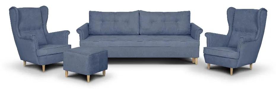 Súprava ELIA Ušiak Modrá ( POHOVKA+2x KRESLO+PODNOŽKA) Súprava trojmiestnej pohovky ELI s funkciou spania + kreslá + ** kreslo + podnožka** ELI je originálna súprava v škandinávskom štýle. Nezvyčajnú eleganciu jej dodávajú drevené nôžky vo farbe dub sonoma, ktoré sú dokonale prispôsobené štýlu súpravy. Funkcia spania a úložný priestor pod sedením robia pohovku veľmi praktickú. ELI skvele nahradí zbytočne veľkú rohovú sedačku s podobným počtom miest. Pohodlie pri sedení i spaní zaisťujú pružiny Bonell vrátane vlnitých pružín a elastickej peny T30. Popis: pružina Bonell opierky na ruky funkcia spanie 1 x úložný prostor na ložní soupravu drevené nožky voľne stojaci nábytok – čalúnený chrbát vysoko kvalitná PUR pena T30 válečkový systém rozkládání konštrukcia z dreva a drevotriesky Šírka: 214 cm Výška: 85 cm Hĺbka: 84 cm Povrch spacej plochy: 190/140 cm Popis Křeslo Ušák: opierky na ruky čalouněná záda drevené nožky vysoko kvalitná PUR pena T30 konštrukcia z dreva a drevotriesky Šírka: 84 cm Výška: 100 cm Hĺbka: 85 cm Popis Podnožka: drevené nožky vysoko kvalitná PUR pena T30 konštrukcia z dreva a drevotriesky Šírka: 46 cm Výška: 43 cm Hĺbka: 46 cm Látka Soro – velúr zo 100% polyesteru s viditeľnou štruktúrou väzby. Látka je mäkká na dotyk, ale nerozťahuje sa. Dosiahla tiež výborného výsledku v teste Martindale, a to až 100 000 cyklov. Znamená to, že je odolná voči oteru a po niekoľko rokov používaní sa nebude odierať. Látky s týmto výsledkom testu sú zaradené medzi tkaniny určené do objektov občianskej vybavenosti a verejných služieb ako napr. do autobusov. Sú schopné vyhovieť vysokej frekvencii používania. Tkanina Soro spĺňa požiadavky Reach so zárukou absencie škodlivých chemikálií. Výrobca odporúča chemické čistenie, pranie i žehlenie pri nízkych teplotách. K údržbe látky sa nesmú používať prostriedky na báze chlóru a alkoholu. K dostaniu v mnohých farbách