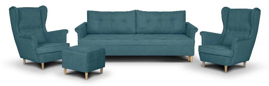 Súprava ELIA Ušiak Zelená ( POHOVKA+2x KRESLO+PODNOŽKA) Súprava trojmiestnej pohovky ELI s funkciou spania + kreslá + ** kreslo + podnožka** ELI je originálna súprava v škandinávskom štýle. Nezvyčajnú eleganciu jej dodávajú drevené nôžky vo farbe dub sonoma, ktoré sú dokonale prispôsobené štýlu súpravy. Funkcia spania a úložný priestor pod sedením robia pohovku veľmi praktickú. ELI skvele nahradí zbytočne veľkú rohovú sedačku s podobným počtom miest. Pohodlie pri sedení i spaní zaisťujú pružiny Bonell vrátane vlnitých pružín a elastickej peny T30. Popis: pružina Bonell opierky na ruky funkcia spanie 1 x úložný prostor na ložní soupravu drevené nožky voľne stojaci nábytok – čalúnený chrbát vysoko kvalitná PUR pena T30 válečkový systém rozkládání konštrukcia z dreva a drevotriesky Šírka: 214 cm Výška: 85 cm Hĺbka: 84 cm Povrch spacej plochy: 190/140 cm Popis Křeslo Ušák: opierky na ruky čalouněná záda drevené nožky vysoko kvalitná PUR pena T30 konštrukcia z dreva a drevotriesky Šírka: 84 cm Výška: 100 cm Hĺbka: 85 cm Popis Podnožka: drevené nožky vysoko kvalitná PUR pena T30 konštrukcia z dreva a drevotriesky Šírka: 46 cm Výška: 43 cm Hĺbka: 46 cm Nosnosť: do 140 kg Látka Soro – velúr zo 100% polyesteru s viditeľnou štruktúrou väzby. Látka je mäkká na dotyk, ale nerozťahuje sa. Dosiahla tiež výborného výsledku v teste Martindale, a to až 100 000 cyklov. Znamená to, že je odolná voči oteru a po niekoľko rokov používaní sa nebude odierať. Látky s týmto výsledkom testu sú zaradené medzi tkaniny určené do objektov občianskej vybavenosti a verejných služieb ako napr. do autobusov. Sú schopné vyhovieť vysokej frekvencii používania. Tkanina Soro spĺňa požiadavky Reach so zárukou absencie škodlivých chemikálií. Výrobca odporúča chemické čistenie, pranie i žehlenie pri nízkych teplotách. K údržbe látky sa nesmú používať prostriedky na báze chlóru a alkoholu. K dostaniu v mnohých farbách