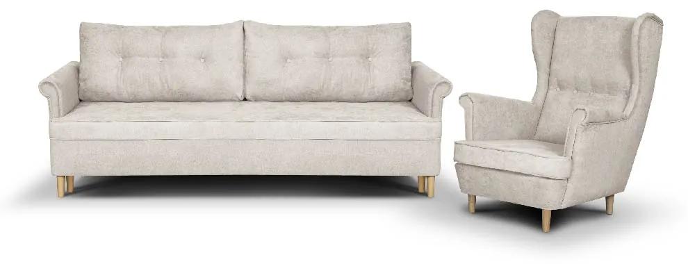 Súprava ELIB Ušiak Béžová ( POHOVKA + KRESLO) Súprava trojmiestnej pohovky ELI s funkciou spania + kreslá + ** kreslo + podnožka** ELI je originálna súprava v škandinávskom štýle. Nezvyčajnú eleganciu jej dodávajú drevené nôžky vo farbe dub sonoma, ktoré sú dokonale prispôsobené štýlu súpravy. Funkcia spania a úložný priestor pod sedením robia pohovku veľmi praktickú. ELI skvele nahradí zbytočne veľkú rohovú sedačku s podobným počtom miest. Pohodlie pri sedení i spaní zaisťujú pružiny Bonell vrátane vlnitých pružín a elastickej peny T30. Popis: pružina Bonell opierky na ruky funkcia spanie 1 x úložný prostor na ložní soupravu drevené nožky voľne stojaci nábytok – čalúnený chrbát vysoko kvalitná PUR pena T30 válečkový systém rozkládání konštrukcia z dreva a drevotriesky Šírka: 214 cm Výška: 85 cm Hĺbka: 84 cm Povrch spacej plochy: 190/140 cm Popis Křeslo Ušák: opierky na ruky čalouněná záda drevené nožky vysoko kvalitná PUR pena T30 konštrukcia z dreva a drevotriesky Šírka: 84 cm Výška: 100 cm Hĺbka: 85 cm Látka Soro – velúr zo 100% polyesteru s viditeľnou štruktúrou väzby. Látka je mäkká na dotyk, ale nerozťahuje sa. Dosiahla tiež výborného výsledku v teste Martindale, a to až 100 000 cyklov. Znamená to, že je odolná voči oteru a po niekoľko rokov používaní sa nebude odierať. Látky s týmto výsledkom testu sú zaradené medzi tkaniny určené do objektov občianskej vybavenosti a verejných služieb ako napr. do autobusov. Sú schopné vyhovieť vysokej frekvencii používania. Tkanina Soro spĺňa požiadavky Reach so zárukou absencie škodlivých chemikálií. Výrobca odporúča chemické čistenie, pranie i žehlenie pri nízkych teplotách. K údržbe látky sa nesmú používať prostriedky na báze chlóru a alkoholu. K dostaniu v mnohých farbách