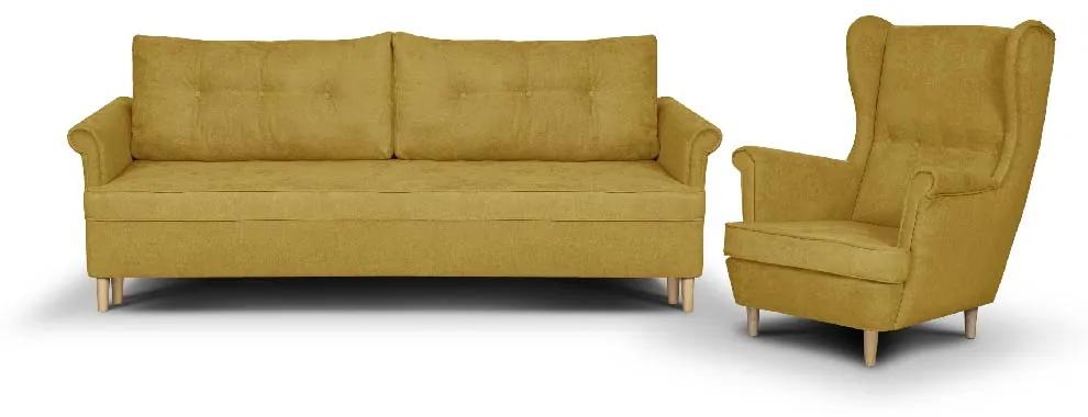 Súprava ELIB Ušiak Horčicová POHOVKA + KRESLO Súprava trojmiestnej pohovky ELI s funkciou spania + kreslá + ** kreslo + podnožka** ELI je originálna súprava v škandinávskom štýle. Nezvyčajnú eleganciu jej dodávajú drevené nôžky vo farbe dub sonoma, ktoré sú dokonale prispôsobené štýlu súpravy. Funkcia spania a úložný priestor pod sedením robia pohovku veľmi praktickú. ELI skvele nahradí zbytočne veľkú rohovú sedačku s podobným počtom miest. Pohodlie pri sedení i spaní zaisťujú pružiny Bonell vrátane vlnitých pružín a elastickej peny T30. Popis: pružina Bonell opierky na ruky funkcia spanie 1 x úložný prostor na ložní soupravu drevené nožky voľne stojaci nábytok – čalúnený chrbát vysoko kvalitná PUR pena T30 válečkový systém rozkládání konštrukcia z dreva a drevotriesky Šírka: 214 cm Výška: 85 cm Hĺbka: 84 cm Povrch spacej plochy: 190/140 cm Popis Křeslo Ušák: opierky na ruky čalouněná záda drevené nožky vysoko kvalitná PUR pena T30 konštrukcia z dreva a drevotriesky Šírka: 84 cm Výška: 100 cm Hĺbka: 85 cm Látka Soro – velúr zo 100% polyesteru s viditeľnou štruktúrou väzby. Látka je mäkká na dotyk, ale nerozťahuje sa. Dosiahla tiež výborného výsledku v teste Martindale, a to až 100 000 cyklov. Znamená to, že je odolná voči oteru a po niekoľko rokov používaní sa nebude odierať. Látky s týmto výsledkom testu sú zaradené medzi tkaniny určené do objektov občianskej vybavenosti a verejných služieb ako napr. do autobusov. Sú schopné vyhovieť vysokej frekvencii používania. Tkanina Soro spĺňa požiadavky Reach so zárukou absencie škodlivých chemikálií. Výrobca odporúča chemické čistenie, pranie i žehlenie pri nízkych teplotách. K údržbe látky sa nesmú používať prostriedky na báze chlóru a alkoholu. K dostaniu v mnohých farbách