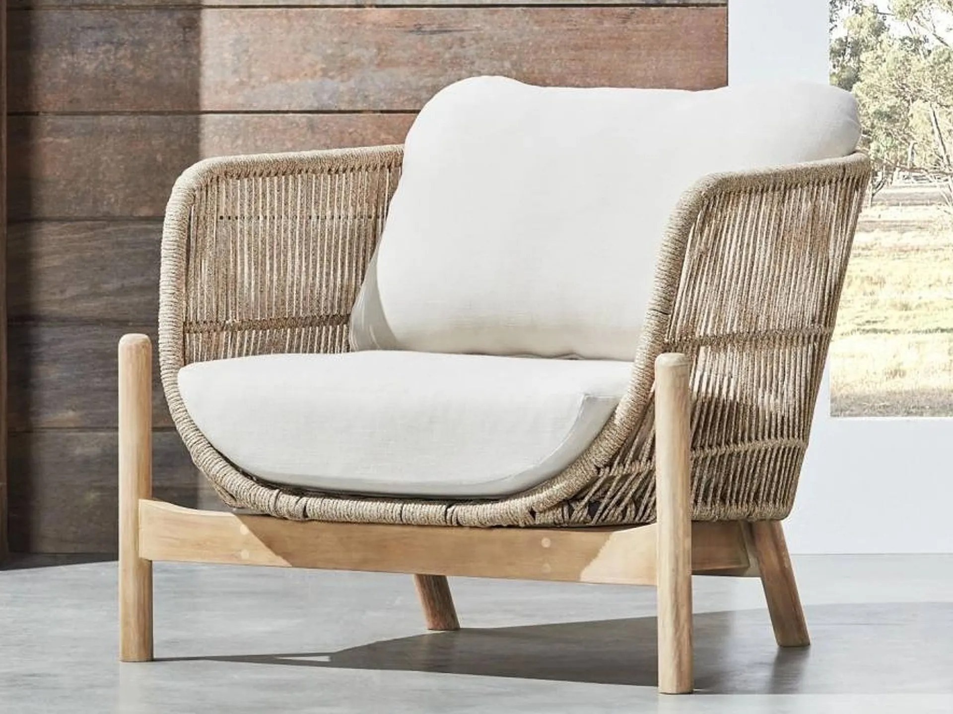 Záhradné kreslo Talara je elegantné a pohodlné, vyrobené z agátového dreva a doplnené o rope výplet a olefínové vankúše. Kreslo je ideálne pre relaxáciu na záhrade alebo terase.