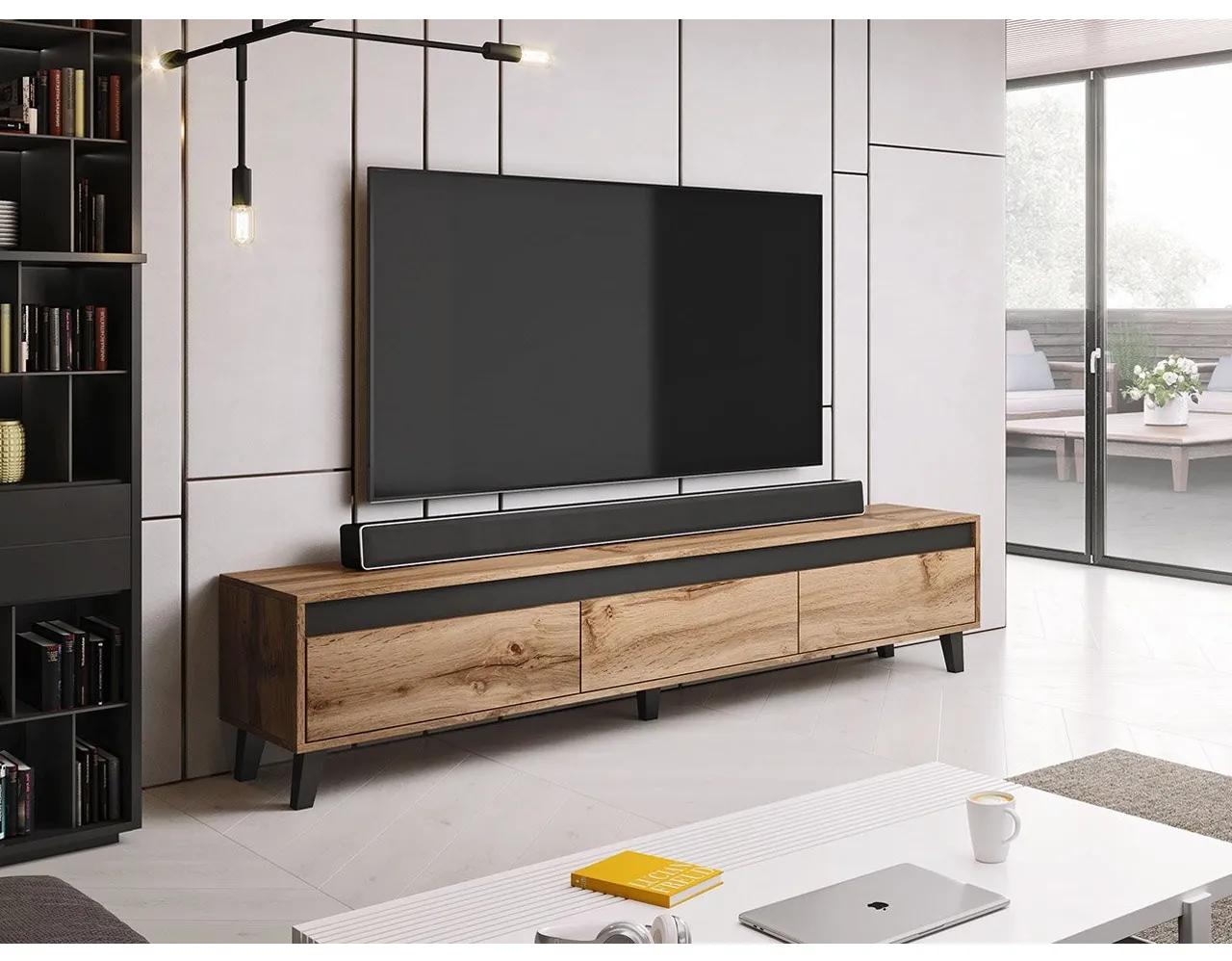 Moderná televízna skrinka Elsie skrášľuje vašu obývačku. Štýl televíznej skrinky zvýrazňujú jej farby. Drevené vzory sú doplnené rovnomerným tmavým pásom umiestneným tesne pod pultom. Nohy nábytku sú udržiavané v tóne konzistentnom s dekorom.Funkčnosť televíznej skrinky určuje optimálny počet a hĺbka zásuviek. Otvárajú sa pomocou systému „push to open“, ktorý výrazne modernizuje spôsob použitia skrinky.Z hľadiska výkonu sa televízna skrinka vyznačuje starostlivým výberom komponentov, ktoré zabezpečia jej pôvodný vzhľad po dlhú dobu.Rozmery:šírka: 185 cm,výška: 42 cm,hĺbka: 38 cmPrevedenie:korpus a front: laminovaná drevotrieska 16 mm,zásuvky sa otvárajú pomocou systému „PUSH TO OPEN“Záruka: 24 mesiacov