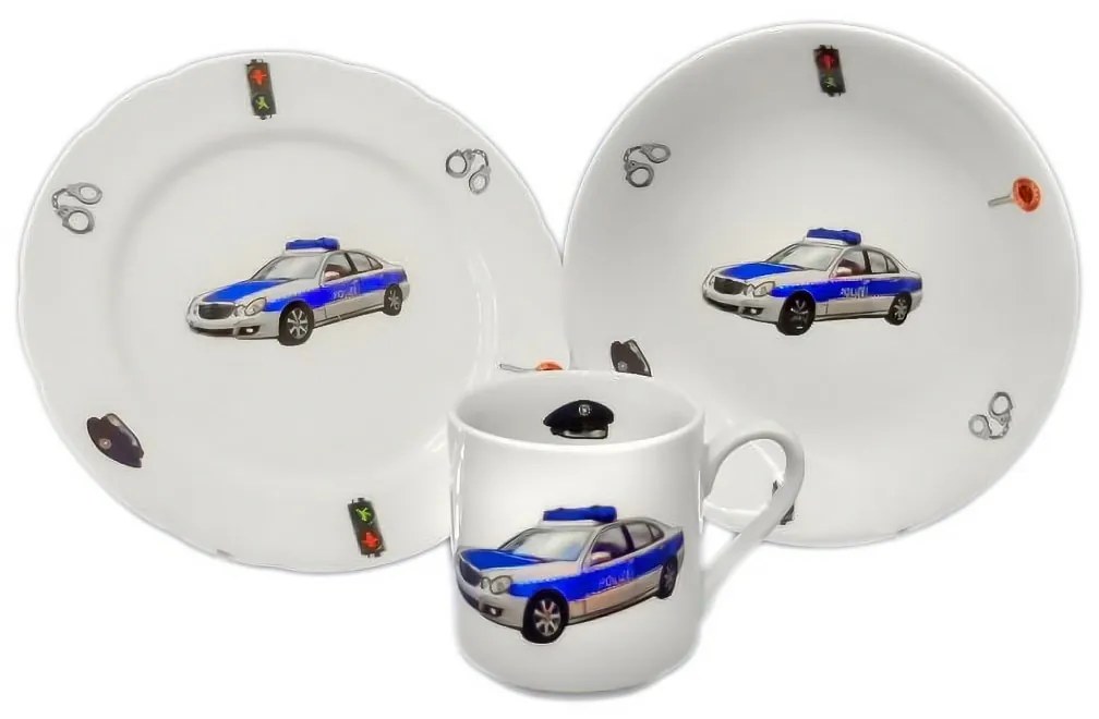 3-dielna porcelánová sada s policajným motívom poteší všetky deti, ktoré raz chcú byť skutočným policajtom. Obsahuje plytký tanier, hlboký tanier miskového typu a hrnček. Všetko v komfortnej veľkosti akurát na detské stolovanie.Sada je vyrobená z kvalitného českého porcelánu.Vďaka použitému materiálu je údržba jednoduchá, riad je možné umývať v umývačke riadu a používať v mikrovlnke.Obsah sady: