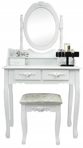 Toaletný stolík s veľkým zrkadlom je snom veľkej väčšiny žien. Tento má 4 zásuvky, do ktorých si môžete odkladať obľúbené kozmetické produkty alebo šperky a mať ich stále po ruke. V sade nájdete aj štýlový taburet. Nosnosť taburetu 100 kg.