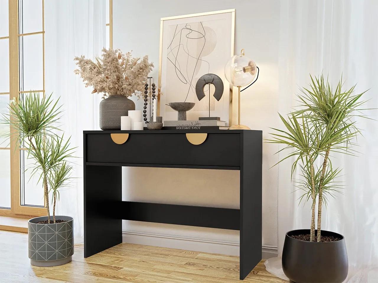 Čierny toaletný stolík Tevois 1SZ je dokonalým modelom do každej miestnosti. Ideálne ako toaletný stolík, stôl a konzola. Dodá elegantný akcent s nádychom luxusu. Vyberte si funkčný a štýlový doplnok do vášho interiéru!Tevois 1SZ zaujme svojim jedinečným vzhľadom. Zlaté úchytky v originálnom tvare dodávajú celku luxusný charakter. Kombinácia čiernej a zlatej dodáva jedinečný šarm a štýl. Perfektný toaletný stolík do spálne, haly alebo obývačky. Variant ponúka dve priestranné zásuvky, do ktorých sa zmestí kozmetika, dokumenty, knihy či iné doplnky.Rozmery:šírka: 100 cm,výška: 78 cm,hĺbka: 40 cmPrevedenie:korpus a čelá: 16 mm hrubá laminovaná doska,ABS a melamínová hrana,guličkové vedenia,kovové nohy,plastové rukoväte zlatej farbyZáruka: 24 mesiacov