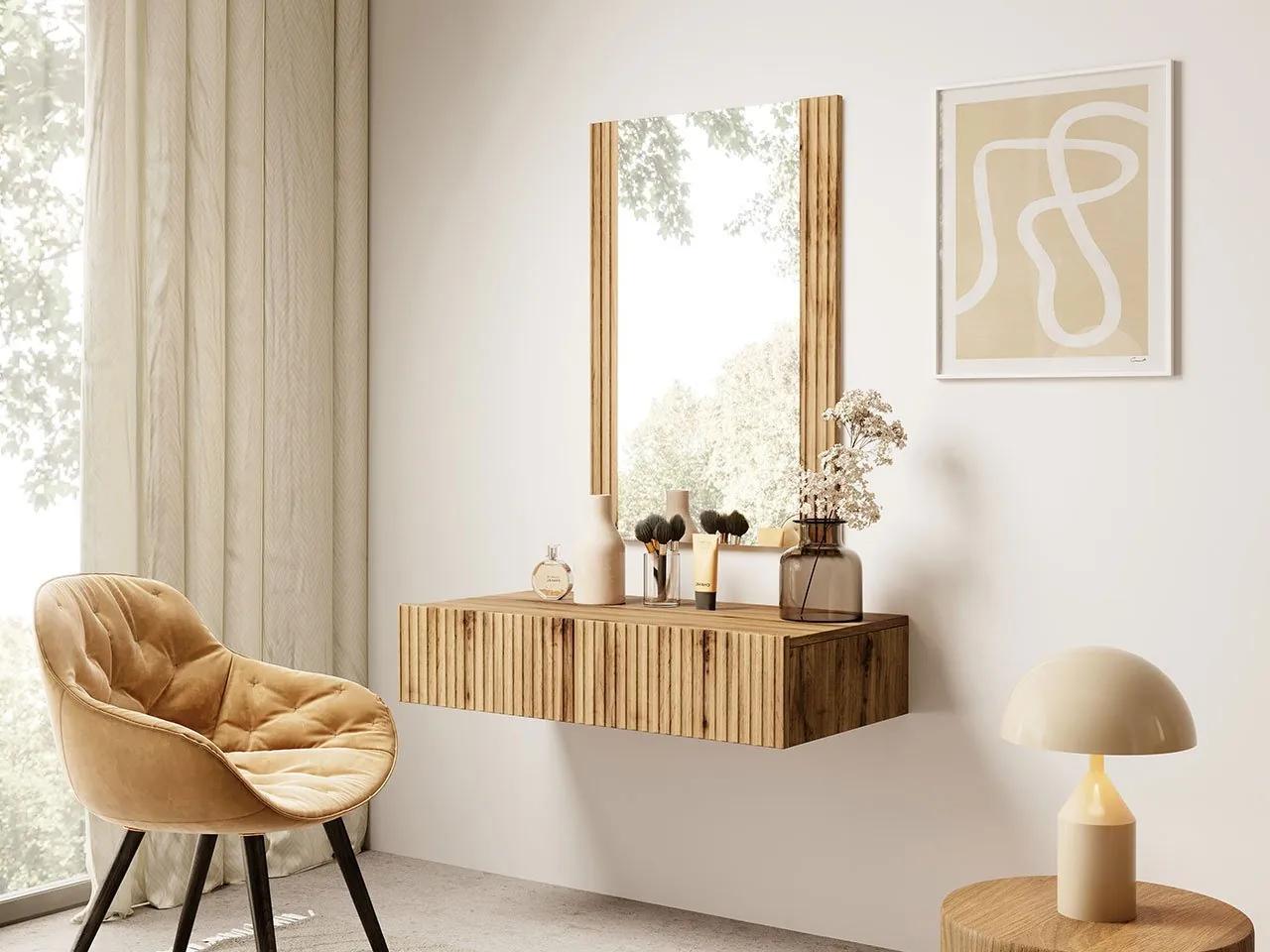 Perfektnou sadou pre každodennú starostlivosť a líčenie je toaletný stolík Tilderi so zrkadlom. Štýlový set doplní priestor vo vašej spálni, poskytne vám priestor na kozmetiku a drobné dekorácie.Súpravu tvorí toaletný stolík s praktickou zásuvkou a zrkadlo s rozmermi: šírka: 54 cm, výška: 80 cm a hĺbka: 2 cm. Celok pôsobí mimoriadne ucelene vďaka ozdobným frézovaným prvkom. Model vytvára dokonalú kombináciu s kreslom alebo stoličkou, na ktorej môžete sedieť a starať sa o svoju krásu.Rozmery:Toaletný stolík:šírka: 80 cm, výška: 17 cm, hĺbka: 42 cm,zrkadlo:šírka: 54 cm, výška: 80 cm, hĺbka: 2 cmprevedenie:korpus: laminovaná drevotrieska hrúbky 16 mm,predná časť: MDF doska,lakovaná doska HDF 2,5,PVC lemovanie 0,5 mm,guľôčkové vedeniaje prirodzené, že medzi korpusom z laminovaných dosiek a čelami z MDF existujú rozdiely v odtieňochZáruka: 24 mesiacov