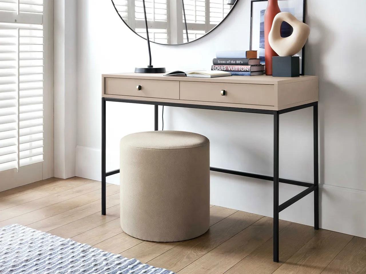 Štýlový Toaletný stolík Tonkor béžový TT104 prináša do interiéru závan novoty. Jednoduchý tvar nábytku v kombinácii s vkusným farebným prevedením podčiarkuje jedinečný šarm obývačky, spálne alebo predsiene. Tento model dobre poslúži aj ako pracovný a študijný stôl. Optimálne veľká horná časť poskytuje dostatok priestoru na počítač, knihy a notebooky. Na druhej strane zásuvky poskytuje praktický úložný priestor napríklad na školské potreby.Tento nábytok plní úlohu toaletného stolíka a podporuje vás v starostlivosti o vašu krásu. Pripevnením zrkadla si vytvoríte pohodlné miesto na úpravu vlasov, líčenie a výber šperkov.Rozmery:šírka: 104 cm,výška: 78 cm,hĺbka: 50 cmPrevedenie:korpus a predná strana: 16 mm hrubá laminovaná doska,ABS lemovanie hrán,výsuv na báze guľôčkových koľajničiek,nožičky: kovový rám 18×18 mm,farbené hliníkové rukoväteZáruka: 24 mesiacov