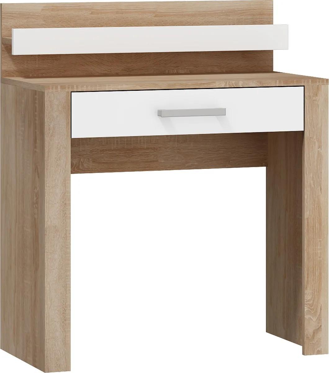 Toaletný stolík Verena VIK 15 je skvelou voľbou pre tých, ktorí hľadajú praktický a pekný kúsok nábytku do spálne alebo obývačky. S výškou 94 cm a hĺbkou 42 cm sa perfektne hodí do každej izby a vďaka kombinácii dreveného vyhotovenia v dubovom odtieni Sonoma, a bielym lesklým prvkom vytvára moderný a elegantný dojem. Stolík sa skladá z jednej zásuvky a otvoreného priestoru, v ktorom môžete uschovať všetky vaše kozmetické a hygienické potreby. Vďaka kvalitnému spracovaniu a materiálom si budete môcť byť istí, že tento toaletný stolík bude slúžiť vašej rodine mnoho rokov.