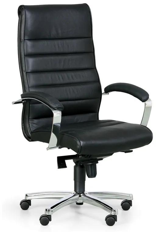 · kancelárske kreslo HORIZONT s potahom z pravej kože na namáhaných častiach, boky a zadná strana z ekokože · hojdacia mechanika s nastavením protiváhy · čalúnené podrúčky pre opierku lakťov · sedák so šírkou 56 cm a hĺbkou 46 cm, operadlo s výškou 67 cm · oceľový kríž, nosnosť 150 kg · kolieska na mäkké podlahy (napr. koberce, linoleum atď.)