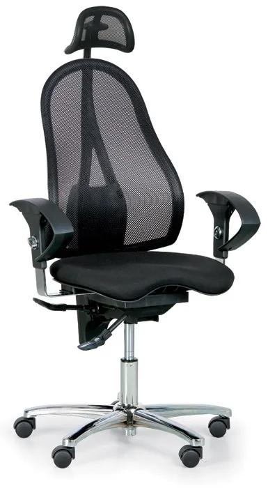 · kancelárska stolička EXETER so sedadlom potiahnutým látkou a operadlom zo sieťoviny · mechanika s permanentnym kontaktom s chrbtom pre zdravé sedenie · balančny systém pre aktívny pohyb chrbtových svalov pri sedení · plastové výškovo nastaviteľné podrúčky s možnosťou nastavenia lakťových opierok nahor a nadol · sedák so šírkou 51 cm a hĺbkou 42 cm, operadlo s nastaviteľnou výškou 54 – 60 cm · oceľový kríž, nosnosť 150 kg · kolieska na mäkké podlahy (napr. koberce, linoleum atď.) · úhlovo a výškovo nastaviteľná hlavová opierka pre ideálnou oporu