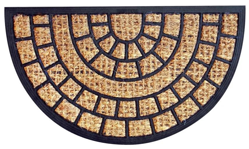 Polkruhová rohožka z kokosových vlákien a gumy od značky Toro, ktorú oceníte najmä pri blatistom počasí. Praktická rohožka pred dvere na čistenie obuvi. Pletené kokosové vlákna. Vďaka gumovej spodnej časti je rohožka stabilná a po podlahe sa nešmýka. Jednoduché čistenie vysávaním alebo vyklepaním. Prírodná hnedá farba.