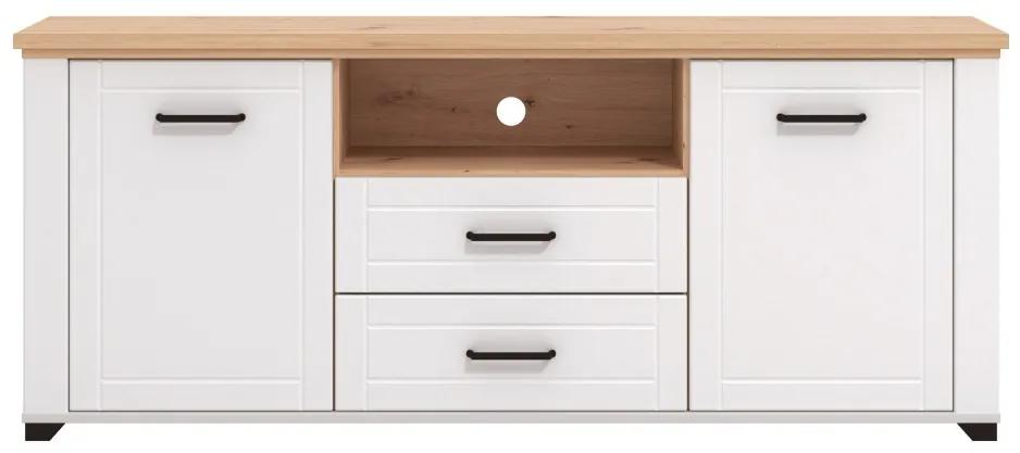 Televízna komoda ponúka úložný priestor do obývacej izby v oku lahodiacom prevedení. Nájdeme v nej otvorenú priehradku pre audiovizuálne zariadenie, a to predovšetkým vďaka otvoru v zadnej strane komody na prípadné pretiahnutie káblov. Pod touto priehradkou sa nachádzajú 2 zásuvky, ktoré po stranách obklopujú 2 skrinky kryté dvierkami. Každá zo skriniek obsahuje 1 vnútornú policu. Celá komoda je tvorená laminom potiahnutým bielou matnou fóliou, okrem hornej dosky tá je v dekore duba artisan. Na zásuvkách aj dvierkach sú umiestnené praktické úchytky v čiernej farbe, ktoré korešpondujú s nôžkami komody.