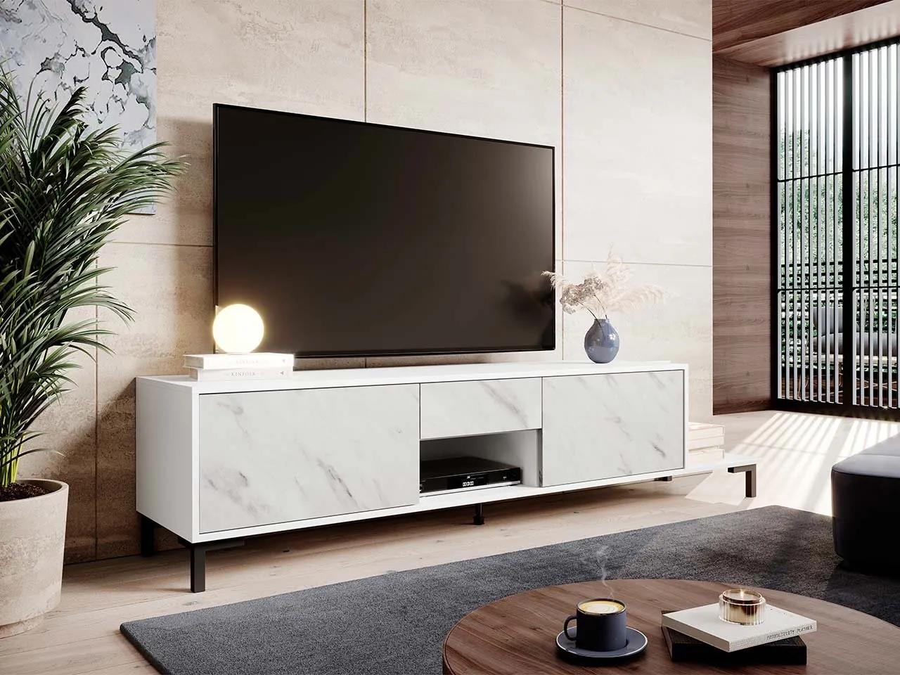 Elegantná TV skrinka Sopeleto podčiarkuje elegantný charakter usporiadania televíznej časti obývacej izby. Kombináciu jednoduchého tvaru s minimalistickou formou dopĺňajú najmodernejšie farby. Čelá bez úchytiek sú ďalším prvkom podporujúcim estetiku nábytku.Z hľadiska funkčnosti ponúka TV skrinka dômyselne usporiadaný úložný systém. Medzi rôznymi úložnými priestormi nájdete výklopné skrinky, ako aj zásuvku a otvorené police. Jeden z nich je zbavený vrchnej časti, takže naň môžete umiestniť napríklad vysoký lampáš, vázu s čerstvými kvetmi alebo iné dekorácie.Rozmery:šírka: 195 cm,výška: 48 cm,hĺbka: 40 cmPrevedenie:matná laminovaná doska s hrúbkou 16 mm,ABS lemovanie hrán,hladké závesy,guľôčkové ložiská,dve klapky otvárajúce sa smerom nadol,čierne plastové nožičky,žiadne úchyty: systém PUSH TO OPEN.Záruka: 24 mesiacov