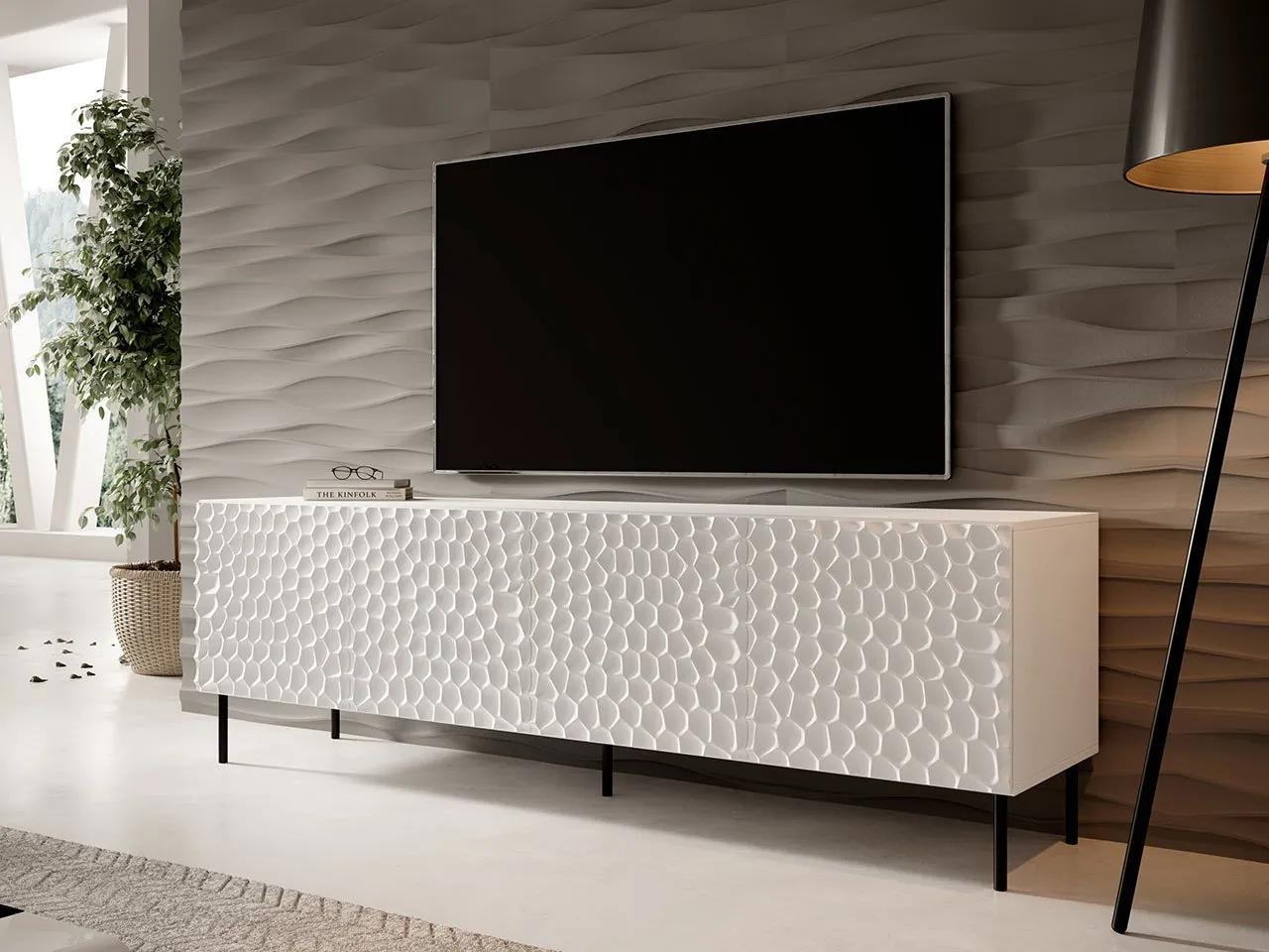 Moderný TV stolík Erizerto je model s mimoriadne dekoratívnym vzhľadom. Dizajnová štruktúra predných plôch mu dodáva osobitý vzhľad. Táto výrazná dekorácia vyzerá v obývacej izbe nádherne – oživuje jej dizajn a zdôrazňuje jej štýlovú prítomnosť.Z praktického hľadiska ponúka TV stolík aj dostatok úložného priestoru. Každý z priestranných úložných priestorov je ideálnym miestom pre elektroniku, kinematografické pomôcky a iné predmety.Výhodou sú aj vysoké nohy. Uľahčujú udržiavanie čistoty podlahy aj pod nábytkom.Rozmery:šírka: 190 cm,výška: 60 cm,hĺbka: 41 cmPrevedenie:korpus: 16 mm hrubá laminovaná drevotrieska,predná strana: 22 mm MDF doska,lemovanie: biela skrinka – polypropylén, čierna skrinka – PVC,kovové nožičky vysoké 20 cm,bežné pánty,žiadne rukoväte,systém otvárania “PUSH TO OPEN”Záruka: 24 mesiacov