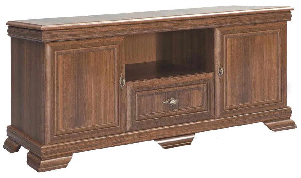 TV stolík/skrinka KRT2 Kraz (samoa king) v rustikálnom štýle je vyrobený z DTD laminovanej/MDF/kovovej konštrukcie. Vďaka svojim rozmierom 158x46x59 cm sa dokonale hodí pre televízory rôznych veľkostí. Tento stolík má hrúbku materiálu korpusu 15 mm, hrúbku vrchnej a dolnej dosky 22 mm a výšku spodného priestoru od podlahy 10,5 cm. Vybavený je ozdobnými lištami a kovovými úchytkami. Okrem toho, stolík má skrinky s dvierkami, otvorený úložný priestor a jednu zásuvku pre ukladanie vecí. Produkt sa dodáva v demonte. Využite tento TV stolík/skrinku na organizovanie svojho obývacieho priestoru a pridajte mu rustikálny štýl.