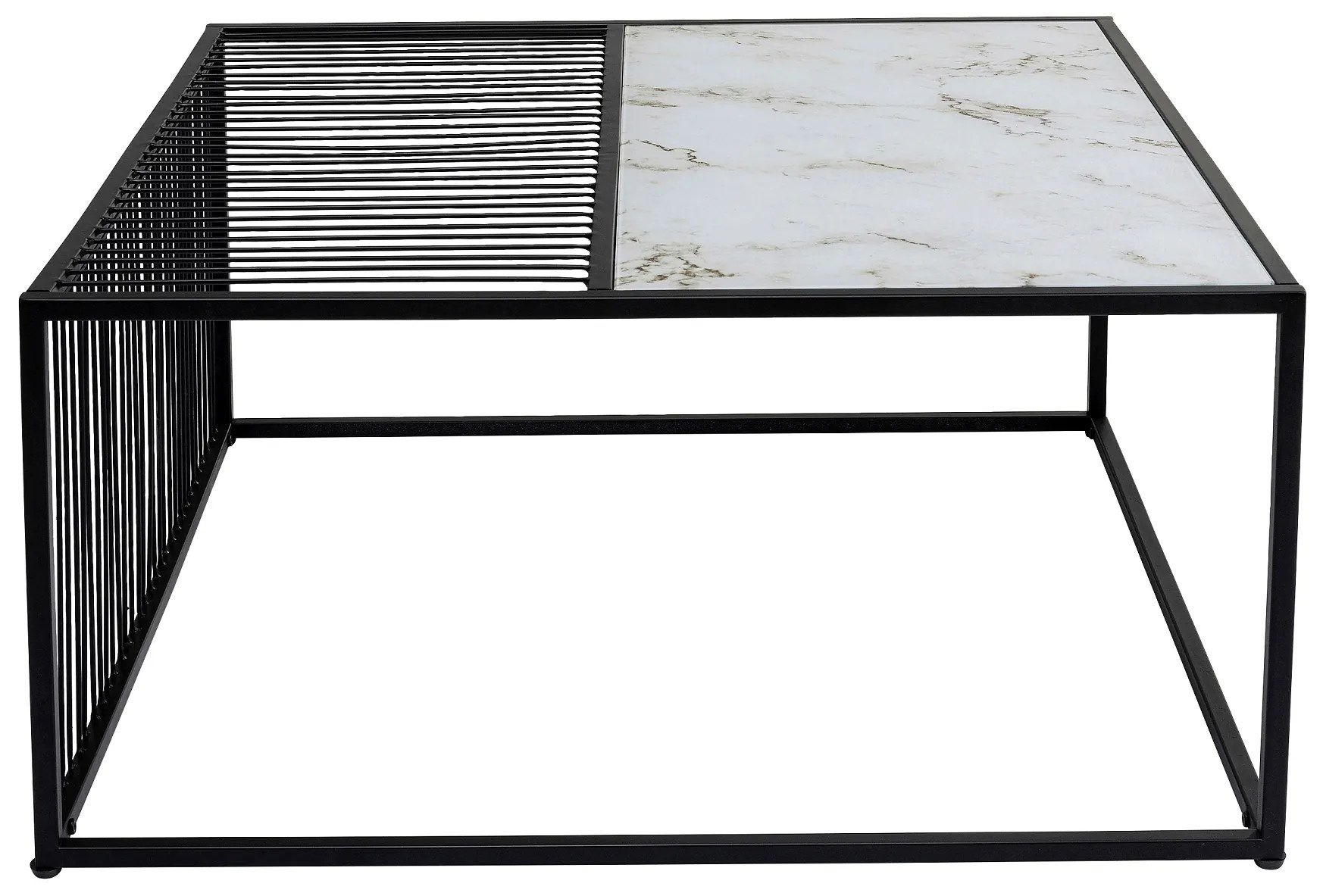 Štýlový konferenčný stolík Twice v pútavom prevedení, vyrobený z vysokokvalitných a odolných materiálov v prepojení dominantnej čiernej farby s bielou stolovou doskou v mramorovom vzhľade.