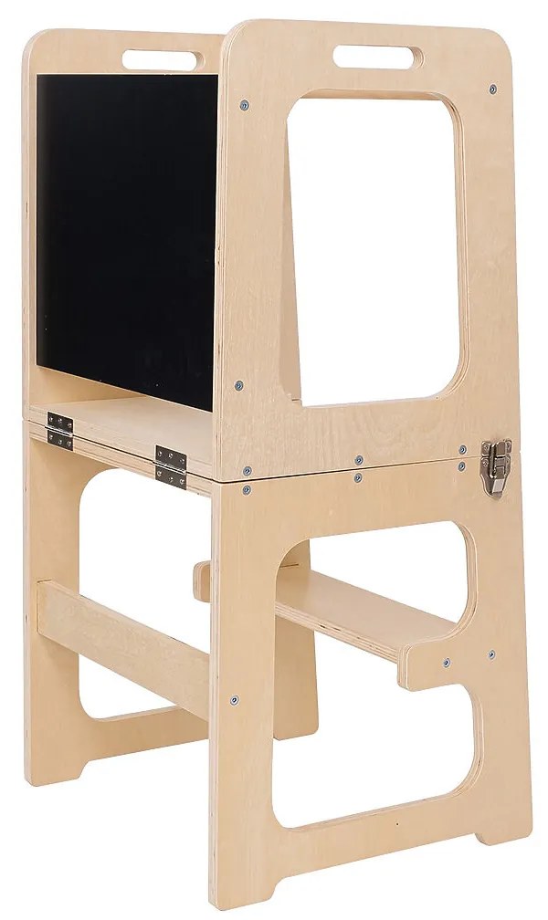 Rozkladacia montessori učebná veža Explore and Play bude praktickým pomocníkom, ktorý poskytne interaktívne a zábavné prostredie pre vašich malých objaviteľov. S touto vežou môžu deti rozvíjať kreativitu, motorické schopnosti a má tiež pozitívny vplyv na celkový rozvoj a socializáciu dieťaťa. Táto učebná veža je nielen zábavná, ale aj multifunkčná – dá sa ľahko premeniť na praktický stolík a stoličku. Vytvoríte tak bezpečné miesto na stolovanie, hranie či tvorenie. Súčasťou veže je aj tabuľa na kreslenie. Veža je stabilná a bezpečná , vyrobená z kvalitných materiálov, opracovaných dohladka. Vlastnosti: viacúčelová – učebná veža, stolík so stoličkou, tabuľa na kreslenie vhodné pre deti od 1 roka – určené pre deti, ktoré samy stoja deti si do veže samy vlezú aj zlezú stabilná a bezpečná – nechcenému pádu zabráni bočnica zo všetkých strán podporuje jemnú motoriku, rozvoj a socializáciu dieťaťa vyrobené podľa Montessori princípov – pomôž mi, aby som to zvládol sám Materiál: MDF – prírodná, nelakovaná Rozmery veže: 92 cm × 42 cm × 38.5 cm
