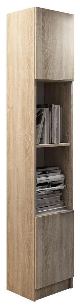 Univerzálna knižnica Kylie R1 je dostupná vo viacerých farebných variantoch, vďaka čomu si ju ľahšie zladíte s predstavou miestnosti. Knižnica sa bude skvele hodiť do obývačky, spálne alebo aj kúpeľne. Jej hornú a spodnú časť tvoria uzavreté skrinky, strednú časť knižnice tvoria otvorené police, napríklad na knihy.Celková výška skrinky je 183 cm a šírka 32 cm – vďaka čomu je jej vystavenie v menších miestnostiach oveľa jednoduchšie. Ozdobným prvkom knižnice sú hliníkové úchytky.Rozmery:šírka: 32 cm,výška: 183 cm,hĺbka: 29 cmPrevedenie:drevotrieska s hrúbkou 16 mm,dyhované PVC dyhou,mini pánt,hliníkové rukoväteZáruka: 24 mesiacov