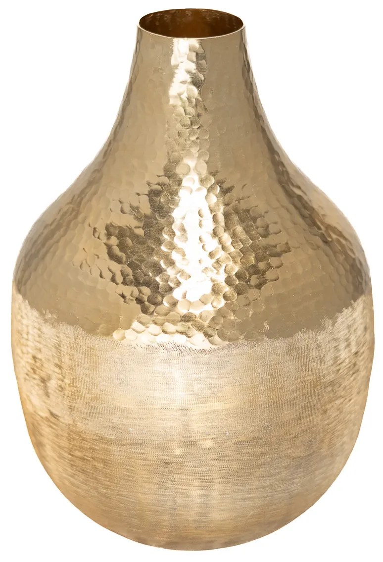 Kovová zlatá váza s nepravidelnou štruktúrou.