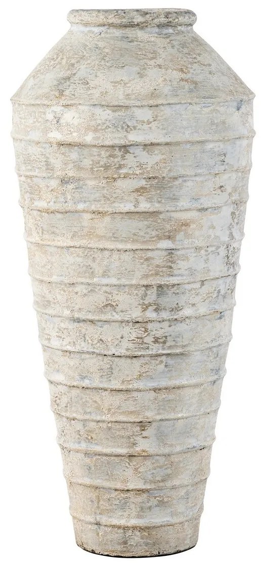 Váza s jedinečným rustikálnym charakterom. Nepravidelný povrch pokrytý jednoduchým vzorom jej dodáva vintage vzhľad. Farebnosť v odtieňoch béžovej a sivej v kombinácii s trením pripomínajúcim prírodnú špinu obohacuje jej štruktúru. Cement, z ktorého je vyrobený, podčiarkuje jeho surový pôvab a nezvyčajnú krásu.