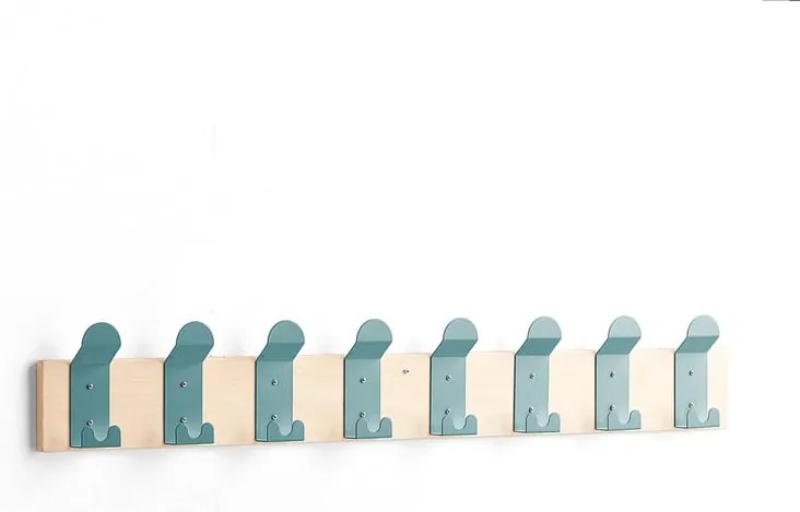 Nástenný vešiak s dvojitými háčikmi. Nástenný vešiak v jednoduchom a atraktívnom dizajne, ktorý predstavuje praktický a priestorovo úsporný variant pre chodby, učebne a šatne. Vešiak je vyrobený z brezovej preglejky s odolnými kovovými háčikmi s práškovým lakom. Skladá sa z ôsmich dvojitých háčikov, ktoré poskytujú dostatok úložného priestoru aj v stiesnených priestoroch.