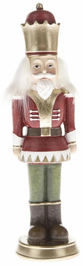 Krásna dekorácia luskáčika sa hodí na postavenie na poličku alebo jedálenský stôl. Je vyrobená v klasických vianočných farbách, červenej a zlatej.