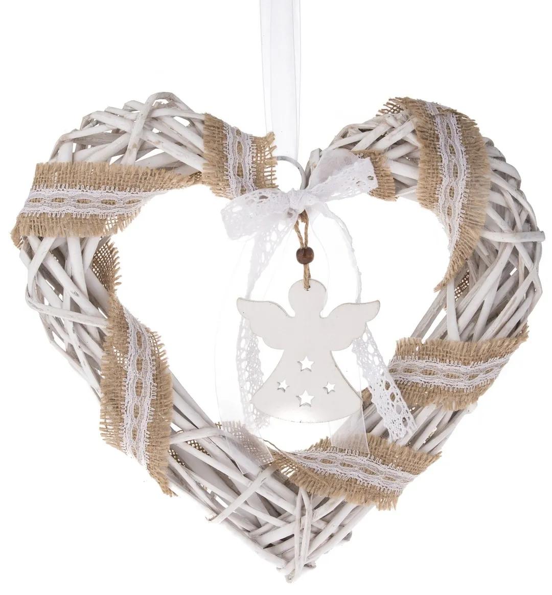 Závesná dekorácia v tvare srdca je ozdobená bielym dreveným anjelikom a prírodnou stužkou. Je vyrobená z prútia s bielou povrchovou úpravou. Dekorácia má kovové očko, na ktorom je upevnená stužka pre zavesenie.