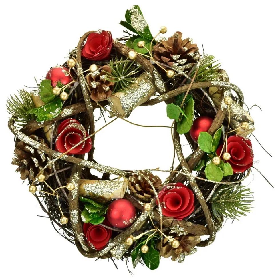 Tento vianočne zdobený veniec z prírodných materiálov bude krásnou ozdobou na vchodových dverách aj v interiéri. Veniec je kvalitne spracovaný a dekorovaný prírodnými vetvičkami, šiškami, suchými listami a doplnený červenými drevenými kvetmi a guľôčkami. Vneste kúsok prírody do vášho domova a vykúzlite si nádhernú vianočnú atmosféru.