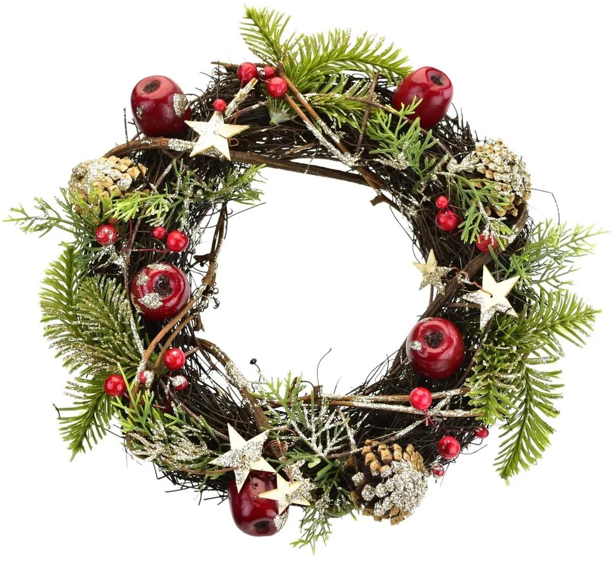 Ozdobný ratanový veniec s červenými umelými jabĺčkami bude krásnou vianočnou dekoráciou na vchodové dvere aj do interiéru. Veniec je kvalitne spracovaný a dekorovaný prírodnými šiškami, hviezdičkami, umelými zelenými vetvičkami a červenými bobuľami.