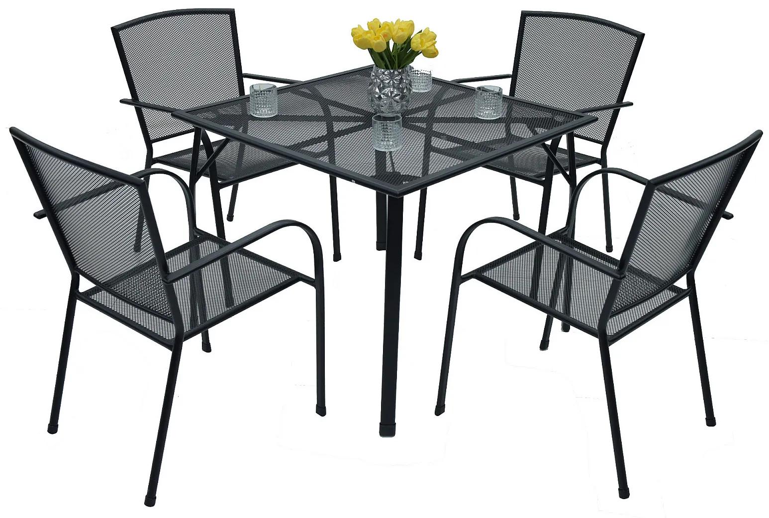 Sestava obsahuje: 1x Kovový stôl EDEN 90×90 cm, 4x Kovová stolička MAYA (čierna)