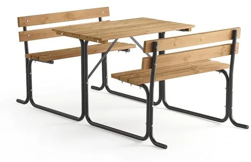 Robustný piknikový stôl s lakovanou galvanizovanou konštrukciou a pevnými lavicami. Doska stola, sedáky i operadlá lavíc sú vyrobené zo švédskej borovice a sú navrhnuté s dôrazom na pohodlie. Klasický piknikový stôl v robustnom dizajne, určený pre príjemné posedenie vonku, napríklad na terasách reštaurácií, na diaľničných odpočívadlách apod. Vďaka operadlu sa môžete pohodlne oprieť a kávu, obed či iba pauzu si jedoducho vychutnať. Konštrukcia je vyrobená z pevných galvanizovaných oceľových trubiek s povrchovou úpravou práškovým lakom v čiernej farbe. Drevené časti sú z hnedo morenej borovice s certifikáciou FSC. V ponuke v dvoch veľkostiach.