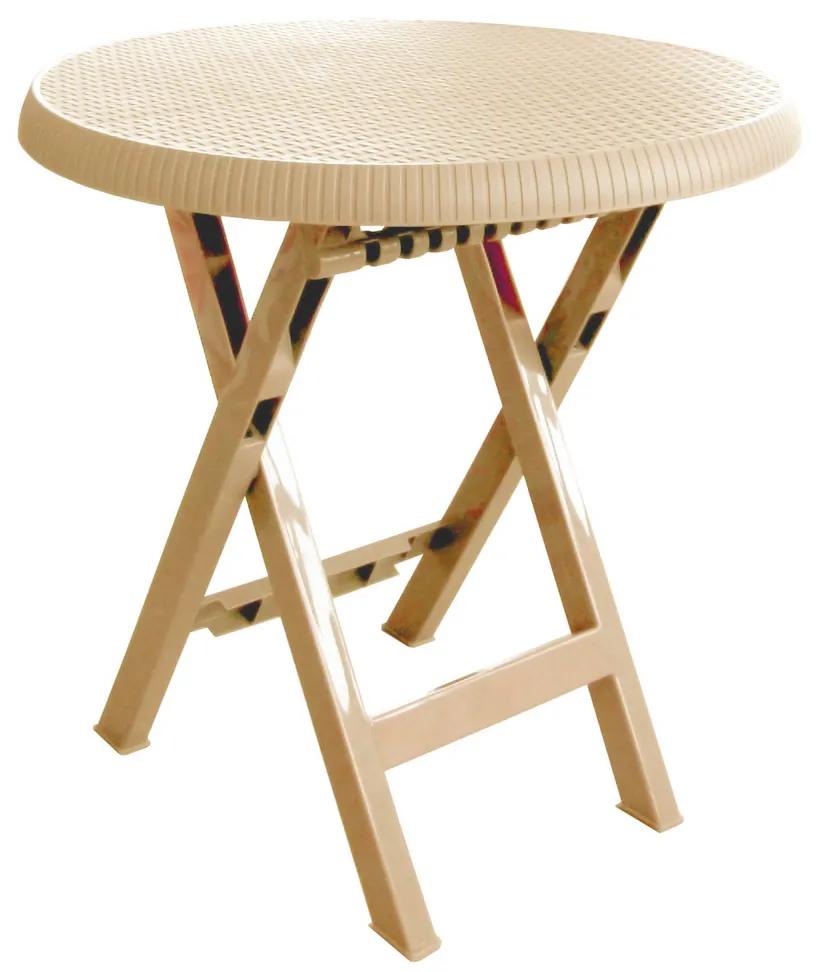 Stolík má okrúhlu hornú dosku z ratanového plastového výpletu krémovej farby. Výhodou stolíka je možnosť zloženia – sklopenia hornej dosky. V prípade silného znečistenia ho ľahko umyjete tlakovou umývačkou.Plast použitý na výrobu stolíku neobsahuje prísady recyklátu, čo zaručuje vysokú kvalitu a dlhú životnosť. Použitá farba má perfektné technologické vlastnosti, ktoré nábytku poskytujú atraktívny vzhľad a vysokú odolnosť voči UV žiareniu. Tým je zaručená dlhoročná stálosť farieb, aj keď je nábytok vystavený priamemu slnečnému žiareniu. Zároveň je nábytok odolný extrémne nízkym teplotám a intenzívnej vlhkosti, vďaka tomu ho možno používať v interiéri aj exteriéri.