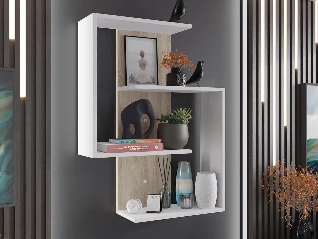 Závesná polica Gittan má inovatívny dizajn. Originálny dizajn police, bude základom pre vystavenie vašich kníh, kvetov, sviečok alebo dekoratívnych figúrok. Môžeme na ňu dokonca rozmiestniť aj vysoké predmety.Za policami sa nachádza zadná stena, vďaka ktorej je celá konštrukcia stabilná. Aj to ešte viac prispieva k modernému, priestrannému vzhľadu nábytku. Nástenná polica má univerzálnu farbu, takže ju môžeme zavesiť na stenu ktorejkoľvek miestnosti v dome a určite zapadne do väčšiny štýlov interiéru.Rozmery:šírka: 65 cm,výška: 85 cm,hĺbka: 19 cmPrevedenie:laminovaná drevotriesková doska hrúbky 16 mm,ABS hrana 0,5 (biela), PVC 0,5 (sonoma),maximálne zaťaženie: do 8 kgZáruka: 24 mesiacov