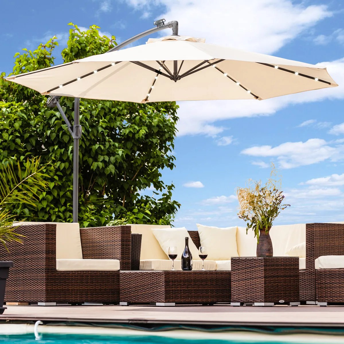 Tento závesný slnečník vám prinesie nielen tieň počas horúcich letných dní, ale tiež pridáva kúzlo večernej atmosfére vďaka integrovanému LED solárnemu osvetleniu. Slnečník je dokonalým spojením funkčnosti a štýlu, ktorý premení každý vonkajší priestor na útočisko pohody a relaxácie. Slnečník okrem tieňa v horúcich dňoch poskytuje tiež ochranu pred miernym letným vánkom a dažďom , čo vám dodá možnosť vonkajšieho posedenia aj pri menej priaznivom počasí.