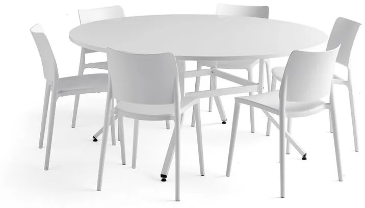Moderná zostava nábytku smiestom pre viacerých ľudí – skvelá voľba pre spoločný obed vjedálni. Stoličky sú vyrobené zpolypropylénu vystuženého sklenenými vláknami, nevyžadujú si údržbu asú odolné voči UVžiareniu. Stôl má odolnú laminátovú dosku, ktorá sa ľahko čistí. Kvalitná zostava nábytku vmodernej kombinácii vlastného dizajnu a jednofarebného vyhotovenia. Či už chcete pridať viac farby alebo zostanete verní striedmejšiemu vzhľadu, na výber máte viacero možností. VARIOUS je vlastný dizajn spoločnosti AJProdukty. Ide oodolný stôl spevnou kovovou konštrukciou. Doska stola je vyrobená zpevného laminátu, ktorý je odolný voči poškriabaniu, nečistotám atekutinám aveľmi ľahko sa udržuje v čistote. Výhodou okrúhleho stola je priamy očný kontakt sprísediacimi kolegami, či už pri obede alebo na schôdzi. Stôl je mimoriadne veľký, takže sa knemu môže usadiť veľa ľudí. Stolička RIO je vyrobená zpolypropylénu vystuženého sklenými vláknami odolného voči UVžiareniu, nevyžaduje si žiadnu údržbu. Sedadlo aoperadlo majú jemný sklon, čo zaručuje pohodlnejšiu polohu pri sedení. Stoličky sú stohovateľné, čo uľahčuje čistenie podlahy aminimalizuje priestor na ich skladovanie.