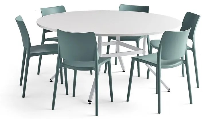 Moderná zostava nábytku smiestom pre viacerých ľudí – skvelá voľba pre spoločný obed vjedálni. Stoličky sú vyrobené zpolypropylénu vystuženého sklenenými vláknami, nevyžadujú si údržbu asú odolné voči UVžiareniu. Stôl má odolnú laminátovú dosku, ktorá sa ľahko čistí. Kvalitná zostava nábytku vmodernej kombinácii vlastného dizajnu a jednofarebného vyhotovenia. Či už chcete pridať viac farby alebo zostanete verní striedmejšiemu vzhľadu, na výber máte viacero možností. VARIOUS je vlastný dizajn spoločnosti AJProdukty. Ide oodolný stôl spevnou kovovou konštrukciou. Doska stola je vyrobená zpevného laminátu, ktorý je odolný voči poškriabaniu, nečistotám atekutinám aveľmi ľahko sa udržuje v čistote. Výhodou okrúhleho stola je priamy očný kontakt sprísediacimi kolegami, či už pri obede alebo na schôdzi. Stôl je mimoriadne veľký, takže sa knemu môže usadiť veľa ľudí. Stolička RIO je vyrobená zpolypropylénu vystuženého sklenými vláknami odolného voči UVžiareniu, nevyžaduje si žiadnu údržbu. Sedadlo aoperadlo majú jemný sklon, čo zaručuje pohodlnejšiu polohu pri sedení. Stoličky sú stohovateľné, čo uľahčuje čistenie podlahy aminimalizuje priestor na ich skladovanie.