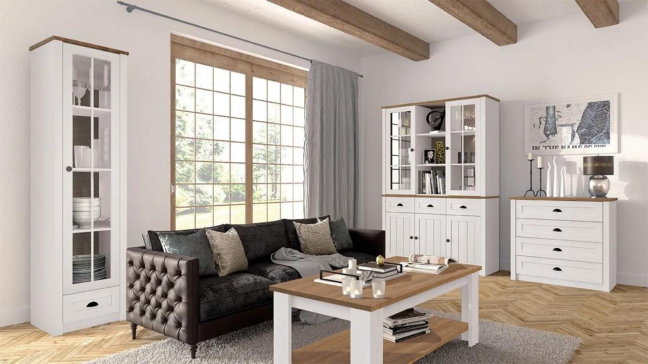 Zostava nábytku do obývacej izby Patty I sa skladá z 5 prvkov, vďaka ktorým vytvoríte ucelené a funkčné usporiadanie. Predstavená kolekcia dokonale podčiarkne provensálsky a rustikálny štýl v interiéri, ale nielen v ňom. Vďaka použitej farebnej kombinácii pôsobí miestnosť útulnejšie.Medzi prvkami, ktoré súprava ponúka, sú dve komody, ktoré poskytnú dostatok priestoru na uloženie bytových doplnkov. Dve vitríny poskytnú priestor na vystavenie dekorácií, kávového servisu alebo obľúbených kníh. Prvý z nich je vysoký podstavec a druhý je formou nadstavca na komodu. Súpravu dopĺňa štýlový konferenčný stolík s policou.Rozmery:Komoda Patty K3SP PA04: šírka: 130 cm, výška: 87 cm, hĺbka: 43 cm,Vitrína Patty W1S PA18: šírka: 50 cm, výška: 198 cm, hĺbka: 43 cm,Vitrína – nadstavec Patty W2D PA19:šírka: 130 cm, výška: 111 cm, hĺbka: 35 cm,Konferenčný stolík Patty ST2: šírka: 120 cm, výška: 51 cm, hĺbka: 60 cm,Komoda Patty K4:šírka: 88 cm, výška: 87 cm, hĺbka: 43 cmPrevedenie:15 mm hrubá laminovaná drevotrieska,horná časť: 36 mm laminovaná drevotrieska,MDF lišta,2,5 mm lakovaná doska HDF,lemovanie: ABS dyha,kľučky: dvere – kľučka, zásuvky – mušlovité,nohy: klzáky,jednoduché pánty bez tichého zatvárania,koľajničky s guľôčkovými ložiskami, plné vysunutie,číre sklo,LED osvetlenie ako doplnková možnosť za príplatokZáruka: 24 mesiacov