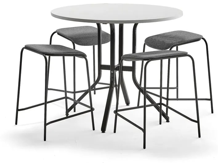 Zostava moderného nábytku so stolom a vyššími stoličkami navrhnutá dizajnérmi spoločnosti AJ Produkty. Zostava je vhodná do menších rokovacích miestností alebo jedální. Skladá sa zo štyroch vyšších stoličiek s mierne zošikmeným sedadlom na ergonomické sedenie a stola s odolnou laminátovou doskou. Vyššie stoličky aj stôl v tejto zostave navrhli dizajnéri spoločnosti AJ Produkty. Tento nábytok vám ponúka viac, čo sa týka vzhľadu aj funkčnosti. Stredne vysoké stoličky a stôl umožňujú sedieť aj stáť, vďaka čomu sú veľmi praktické a všestranné. Zostava je ideálna do menších rokovacích miestností a jedální. Moderný a štýlový stôl VARIOUS má pevnú oceľovú konštrukciu. Doska stola je vyrobená z laminátu, ktorý je odolný voči poškriabaniu, nečistotám a tekutinám. Veľmi ľahko sa udržuje v čistote. Špinu ľahko zotriete vlhkou handričkou. Stôl je vhodný do rôznych prostredí. ATTEND je stredne vysoká, vkusná a stohovateľná stolička s mierne sklopeným sedadlom pre dosiahnutie ergonomickej pozície pri sedení. Sedadlo má čalúnenie textilným poťahom z prírodných vlnených a ľanových textilných vlákien s certifikátom Ecolabel. Opierky nôh sú na troch stranách stoličky, čím zabezpečujú pohodlie a podporu pre vaše nohy a chrbát.