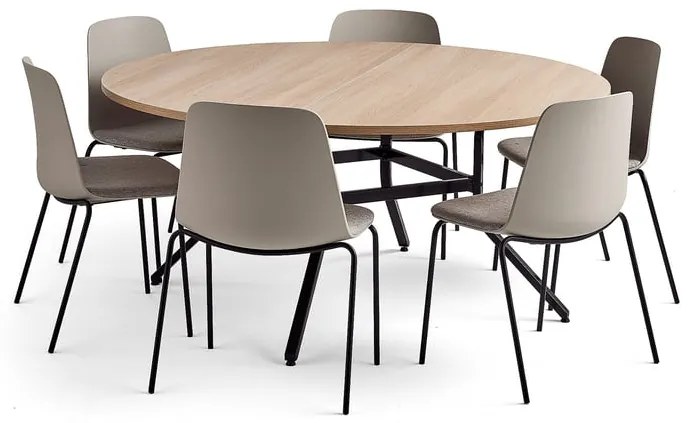 Moderná zostava nábytku so šiestimi stoličkami potiahnutými látkou a extra veľkým stolom. Stôl a stoličky sú vhodné do konferenčných miestností a jedální. Stoličky majú štýlový, moderný dizajn a pohodlné čalúnené sedadlá. Stolová doska je vyrobená z odolného dubového laminátu. Štýlová zostava nábytku, pri ktorej sa usadí niekoľko ľudí. Tento stôl a stoličky sú pohodlné, štýlové a praktické. Sú vhodné do jedální, do zasadacích a konferenčných miestností. Výhodou okrúhleho stola je, že s kolegami na seba dobre vidíte, či už pri obchodnom rozhovore, pri prestávke na kávu alebo diskusii o kreatívnom projekte. Stôl je mimoriadne veľký, takže sa k nemu môže usadiť viacero ľudí. Doska stola je vyrobená z odolného, štýlového dubového laminátu, ktorý sa ľahko utiera. LANGFORD je moderná stolička s dokonalou kombináciou pevnej konštrukcie a atraktívneho vzhľadu. Je stohovateľná a má mäkké čalúnené sedadlo poskytujúce väčšie pohodlie, vďaka čomu sa na nej príjemne sedí aj dlhší čas. Jednoducho stolička na každodenné používanie.