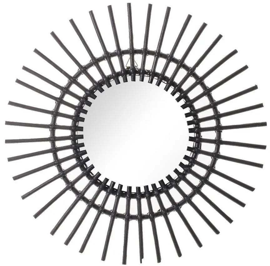 Designové okrúhle zrkadlo závesné na stenu.Zrkadlo je zdobené čiernym ratanovým rámom, ktorý vrhá jemné tiene. Tvar pripomína slnečné lúče.Ideálne do interiéru v etno štýle najmä do obývacej izby, spálne alebo chodby.Rozmery: priemer celkový 55 cm, hĺbka 3cm, priemer zrkadla 23cm.Materiál: ratan.Farba: čierna.