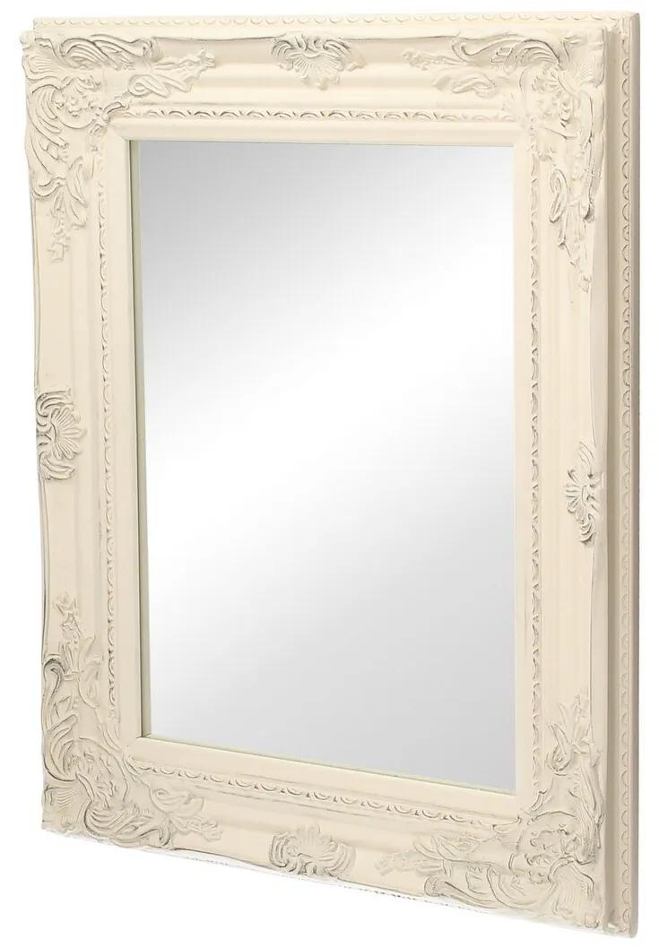 Dekoratívne zrkadlo v štylizovanom ráme krémovej farby s hnedým trením.Osadené v jednoduchom obdĺžnikovom ráme s fantazijným dekorom, ktorý zobrazuje kvetinové motívy.
